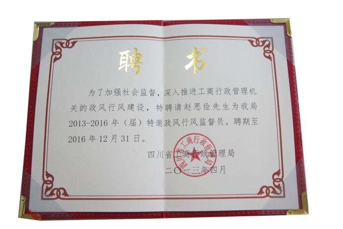 ??? 5月,為加強社會監督,推進全省工商行政管理系統的政風行風建設,四川省工商行政管理局聘請了2013-2016年(屆)特邀政風行風監督員,集團趙董事長作為企業家代表也獲邀請。此次特邀的監督員包括省政協委員、省直機關工委巡視員李成林;省政協委員、省政法委巡視員賈月成等14位來自省內政界、商界、媒體的代表。特邀監督員人選由省級工商局請政府糾風工作主管部門推薦,經征求本人意見后正式聘請并頒發聘書和證件。